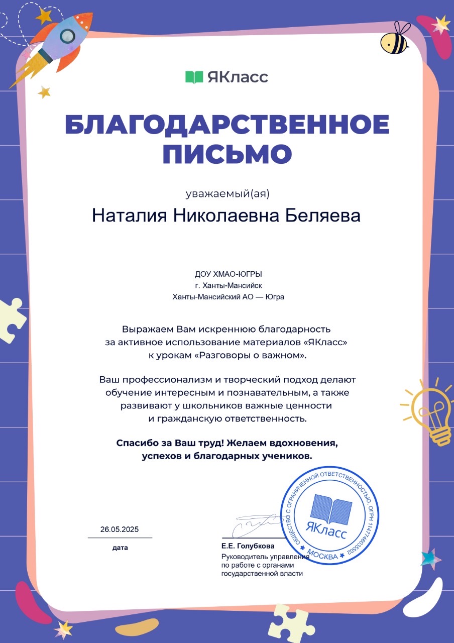 4. Благодарственное письмо за активное использование материалов "ЯКласс" к урокам "Разговоры о важном" (просмотр)