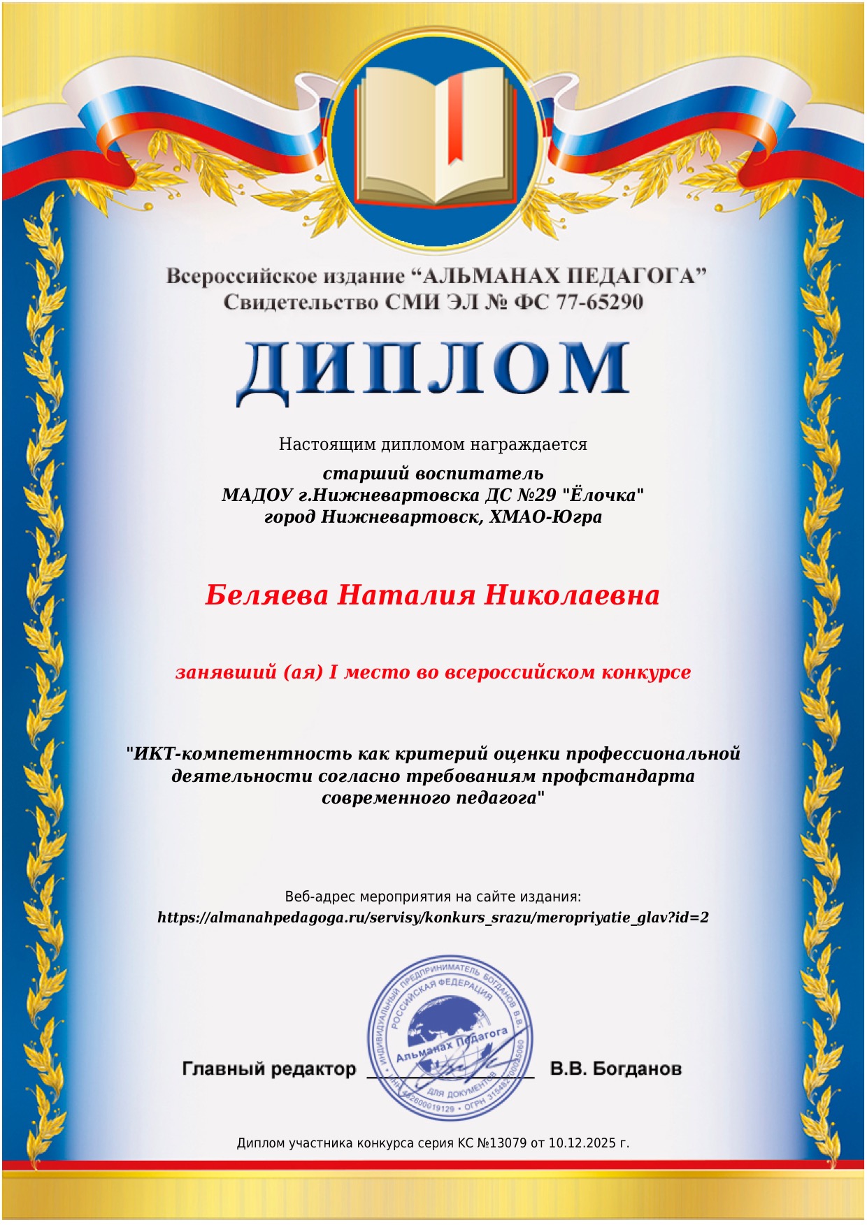 1. Диплом 1 место Всероссийского конкурса "ИКТ-компетентность как критерий оценки профессиональной деятельности согласно требованиям профстандарта современного педагога" (просмотр)